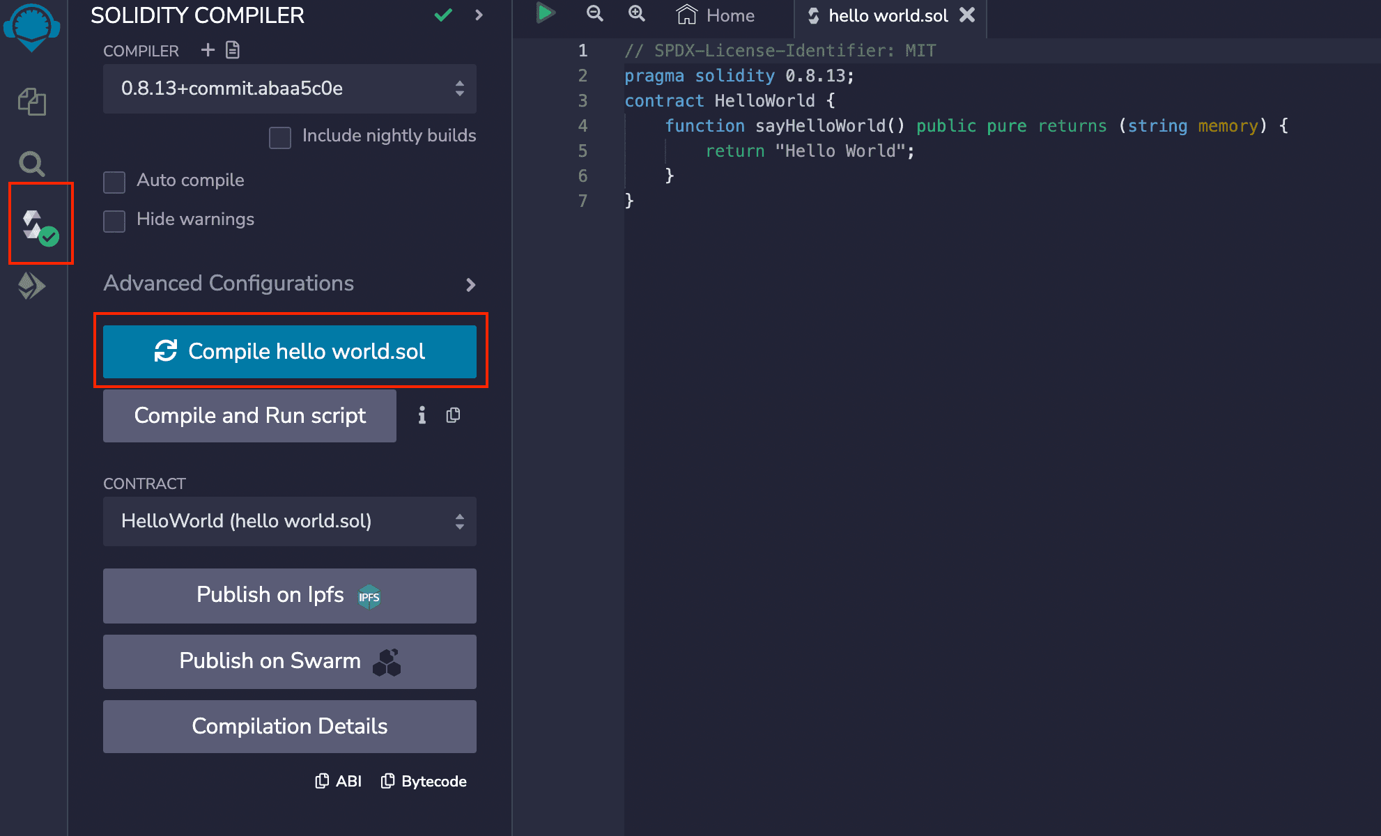 Now, the smart contract is compiled, Core is injected, and we are ready to deploy our Hello world contract. Click "Deploy."